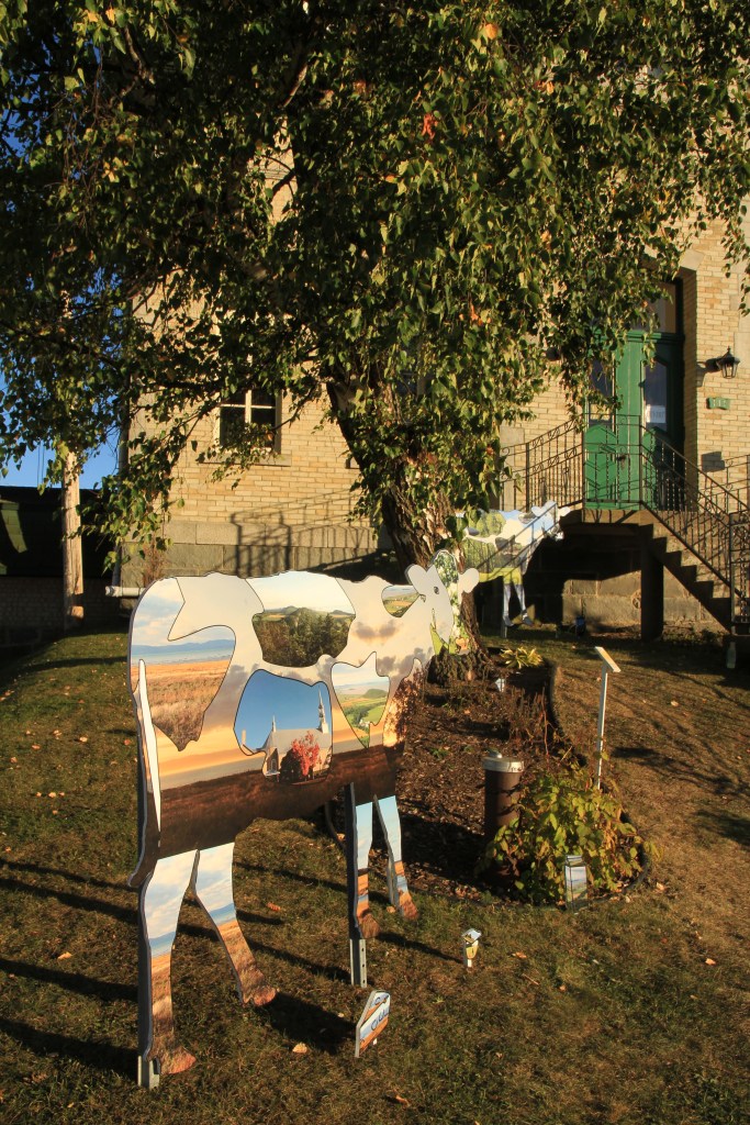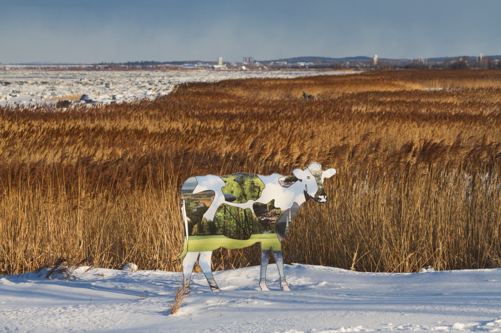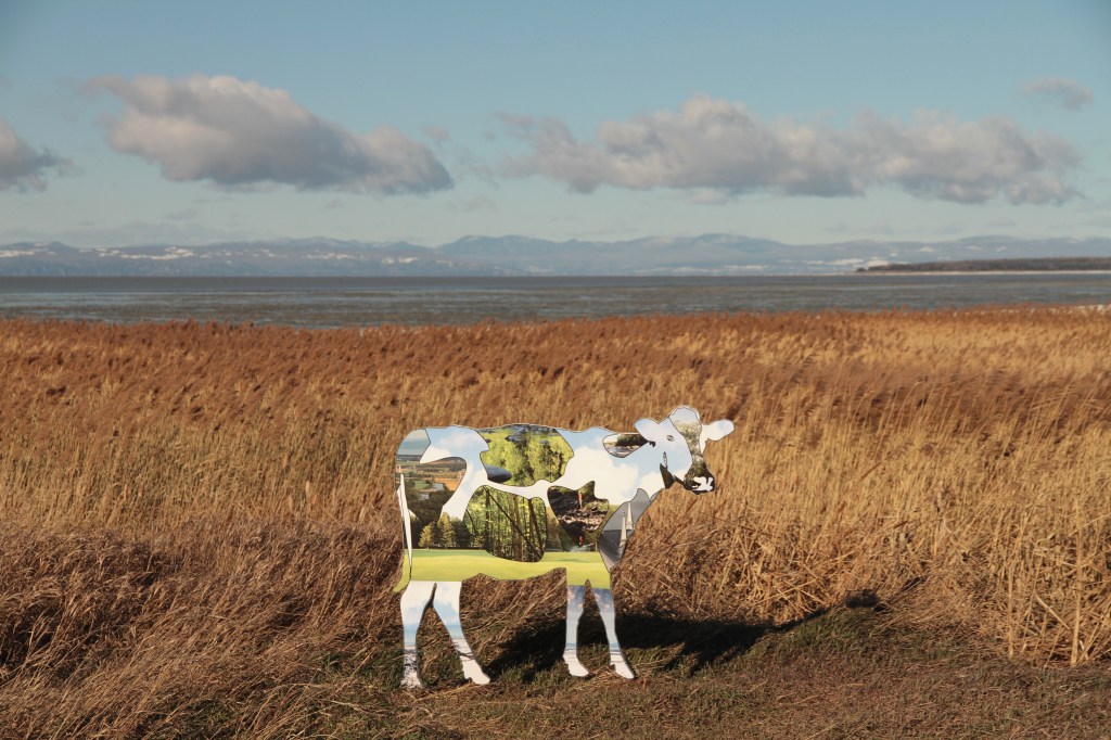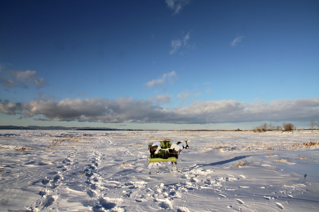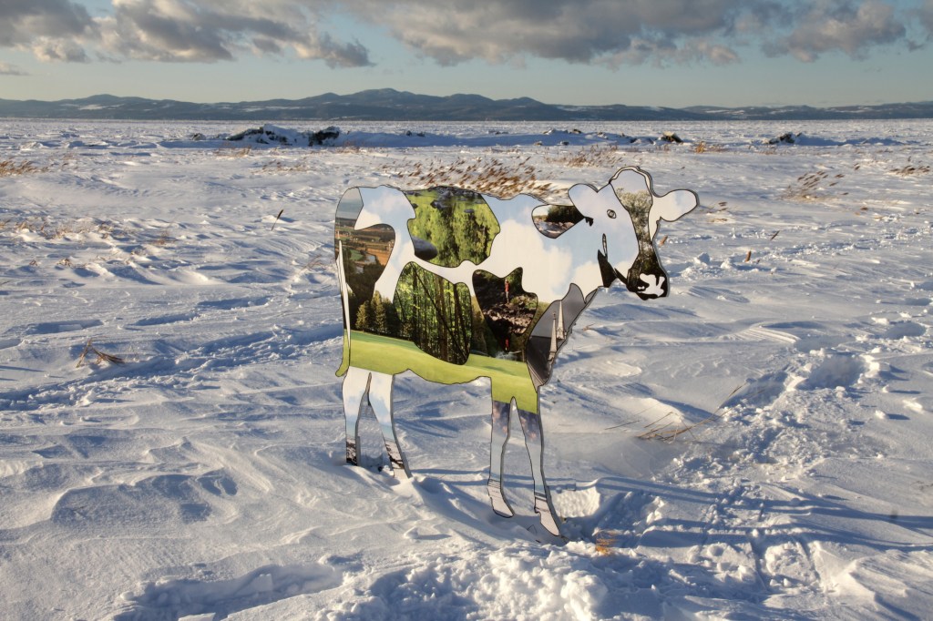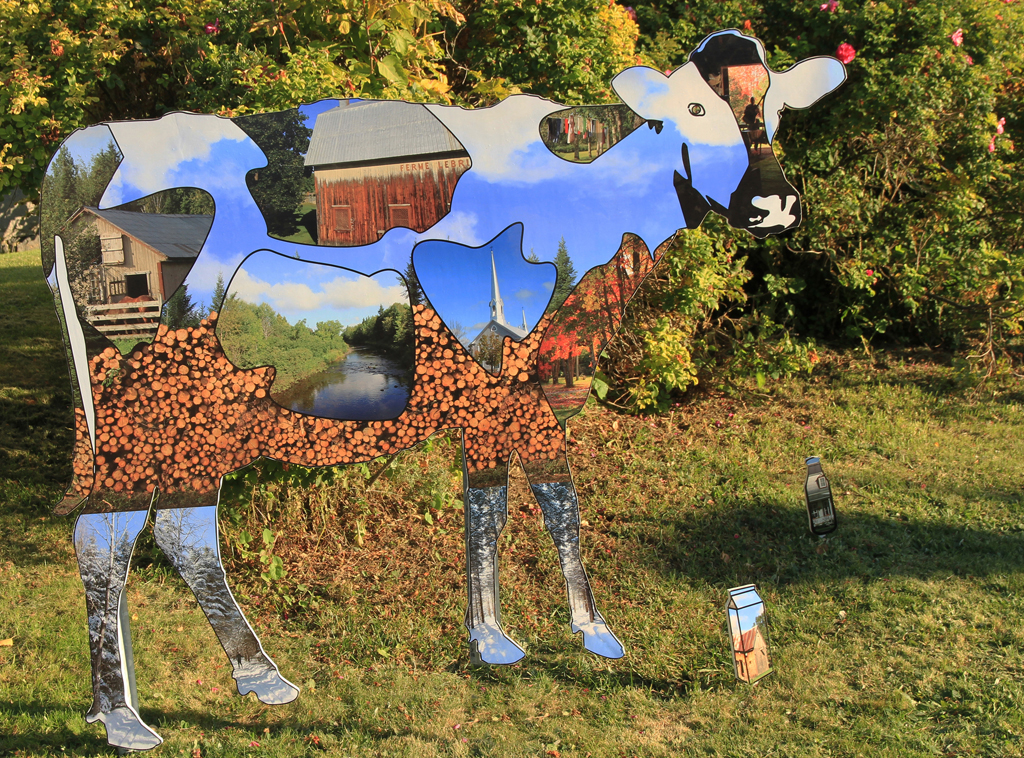 En partant de l’importance de l’agriculture dans notre milieu, j’ai pris la silhouette de la vache et de ses produits comme étant des symboles importants du premier maillon de la chaine alimentaire. Les silhouettes, sorties de leur contexte et intégrées à des lieux passants, ont comme effet de provoquer un effet de surprise, suscitant la curiosité.
