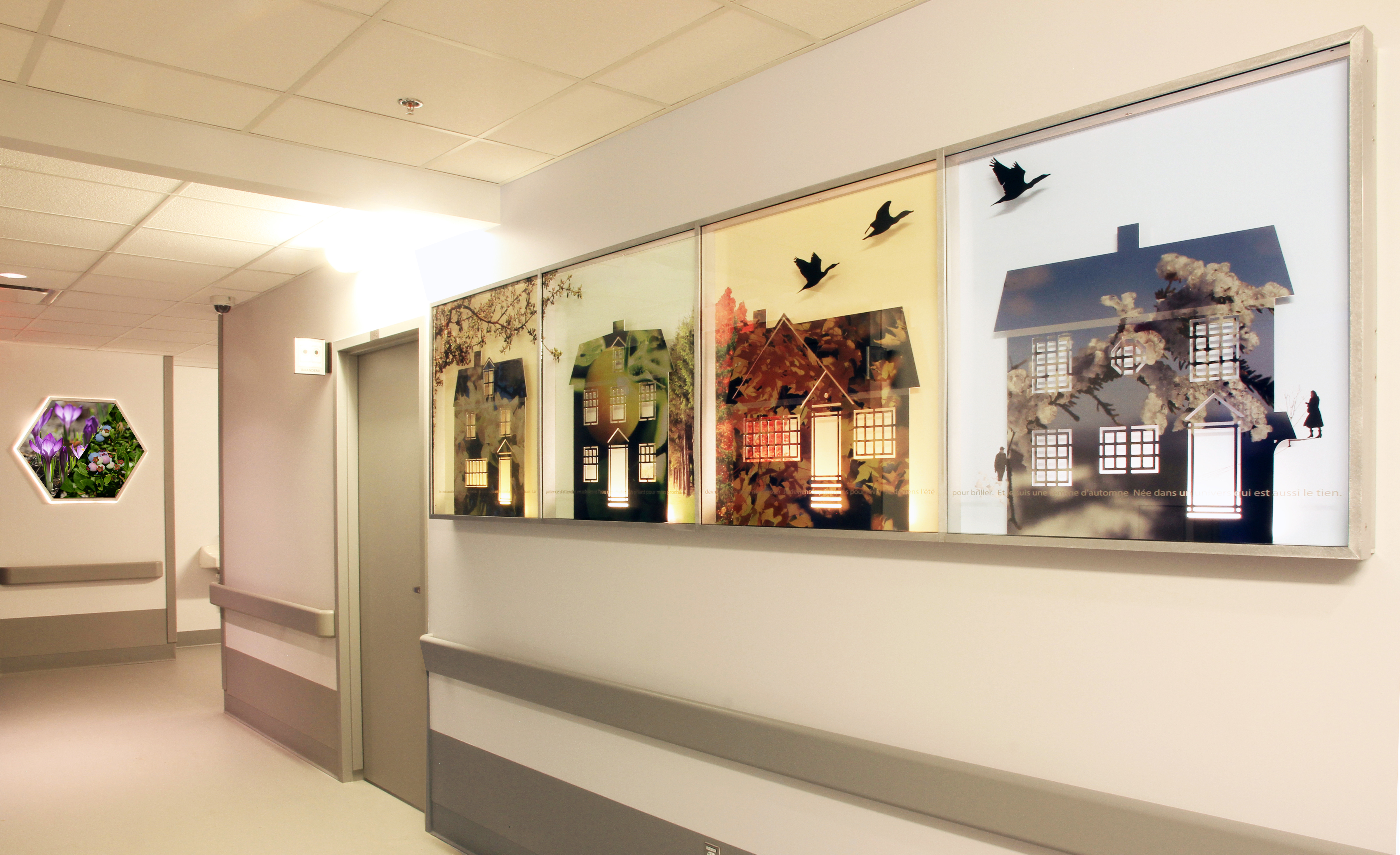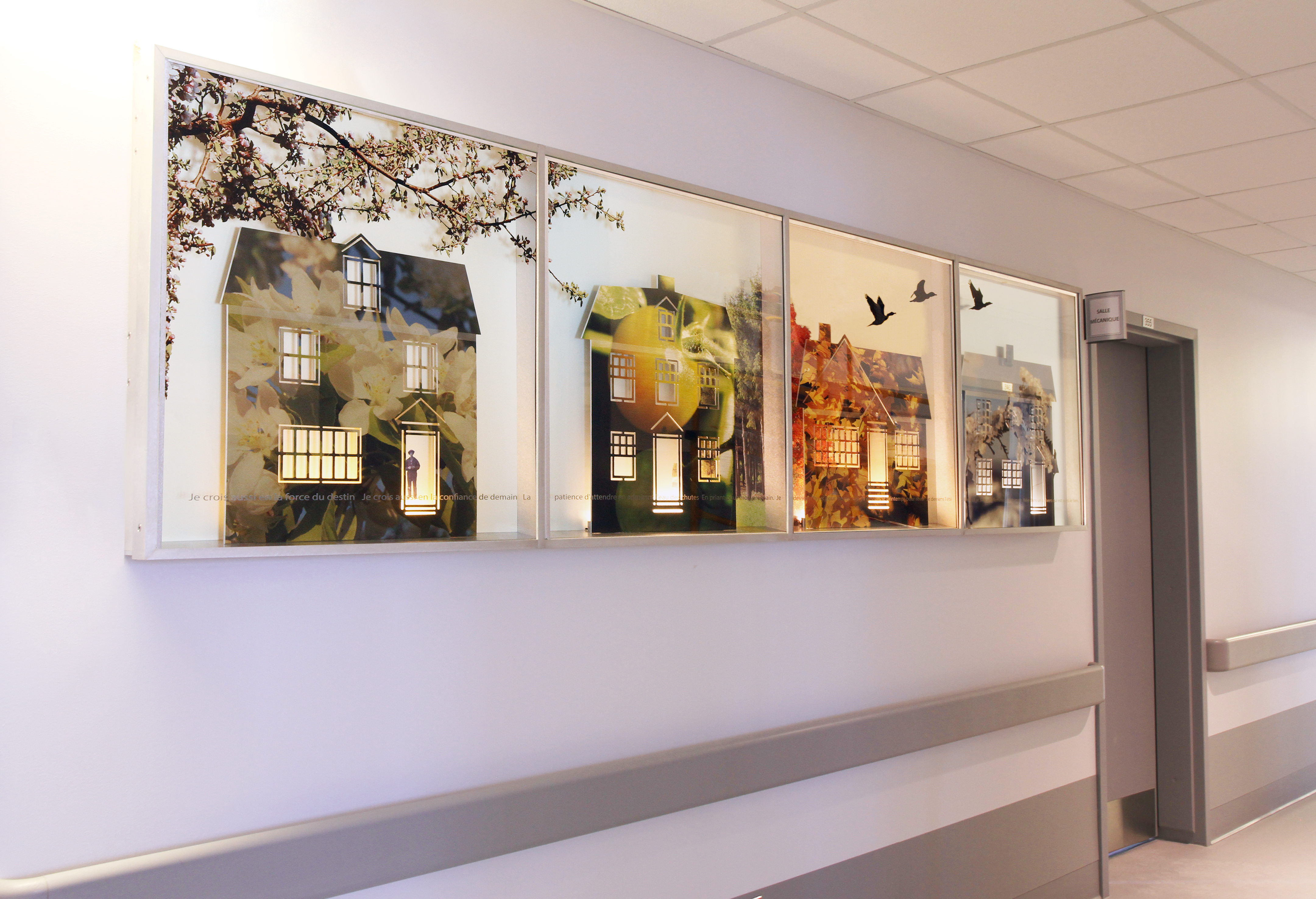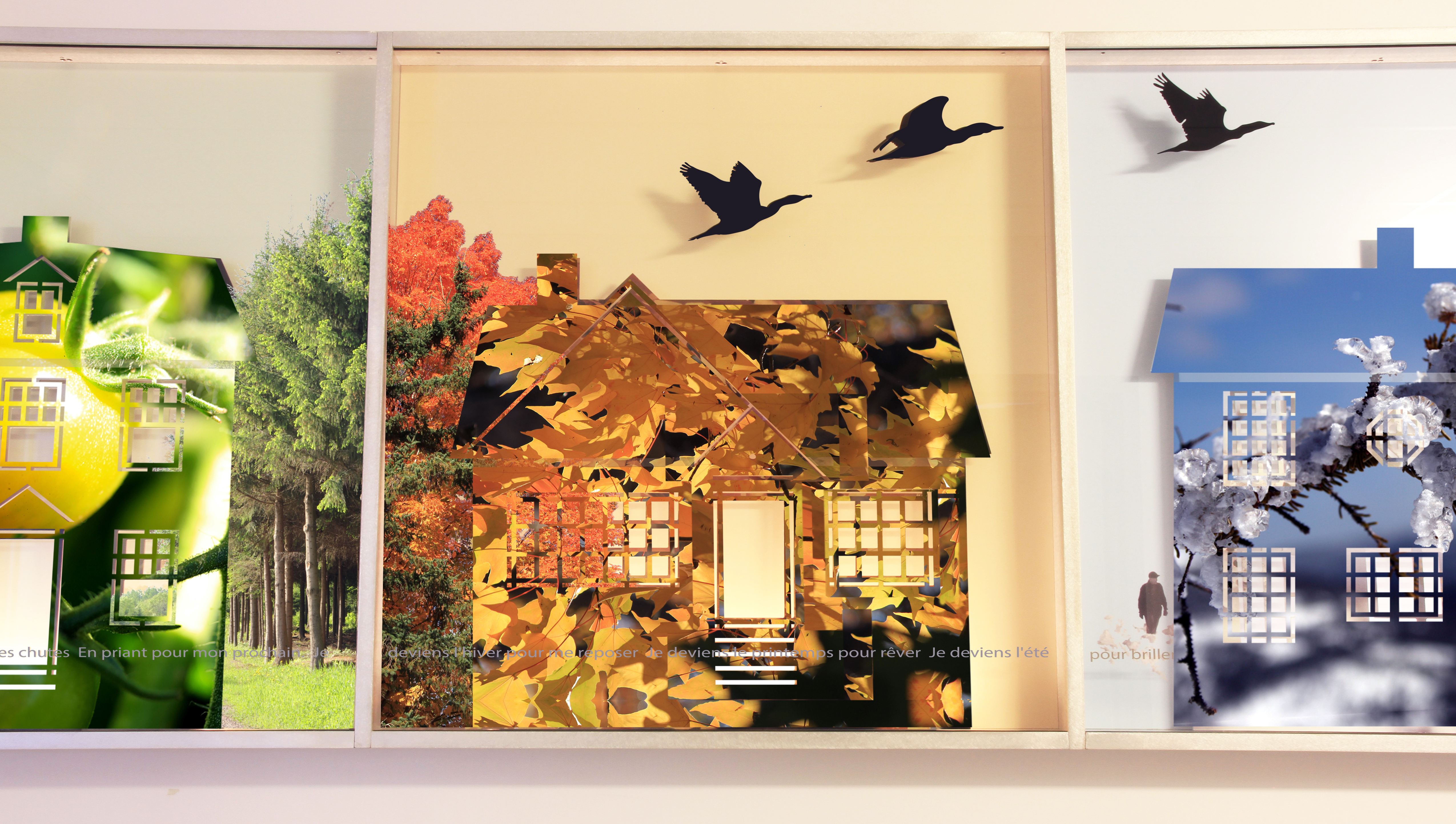 J’ai choisi de travailler avec les maisons comme métaphores d’intimité, de refuge, d’abri, de rencontres et de rassemblements. Chacune d’elles a été revêtue par une photographie qui caractérise l’une des saisons avec ses couleurs et sa lumière particulière, comme étant symbole des cycles de la vie et de la continuité dans le temps. Les maisons sont éclairées de l’après-midi au soir, par l’arrière, laissant passer une lueur par les fenêtres et la porte, afin de recréer une ambiance d’intimité, de réconfort, comme à l’intérieur de nos foyers.