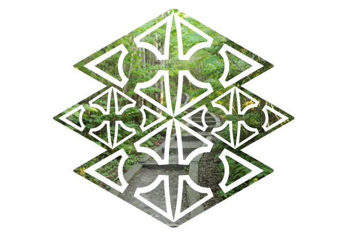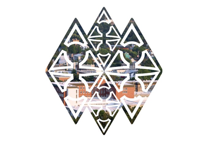 Des détails du patrimoine architectural et des photographies de différents lieux de la ville s’inscrivent dans des formes géométriques, évoquant le mouvement et le dynamisme qui animent la communauté.