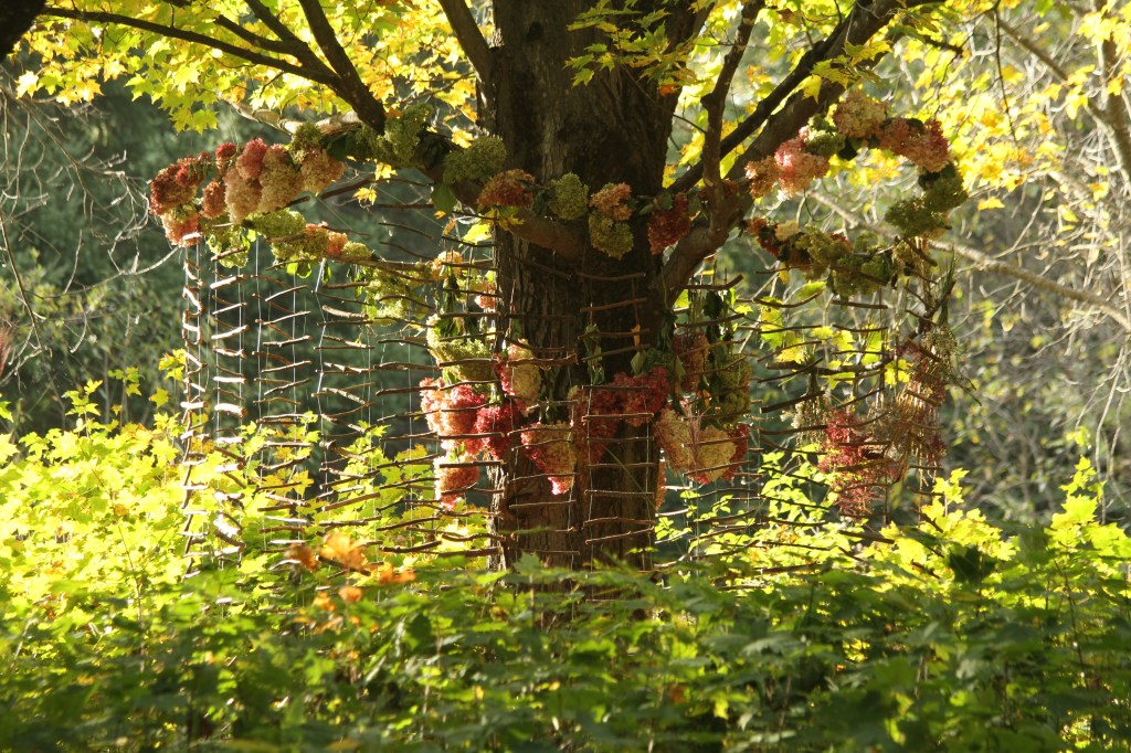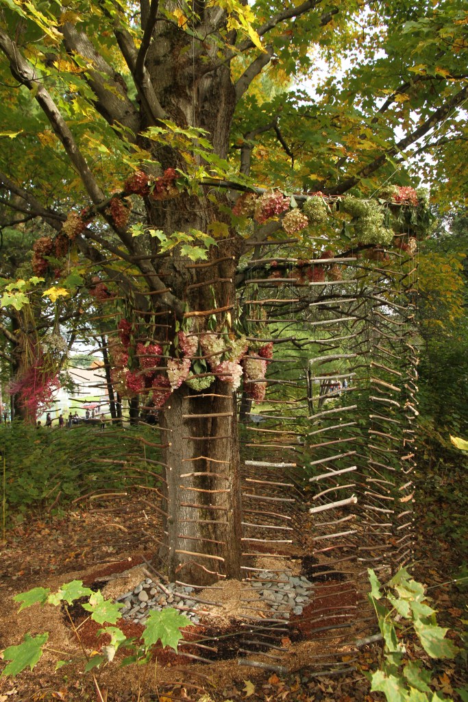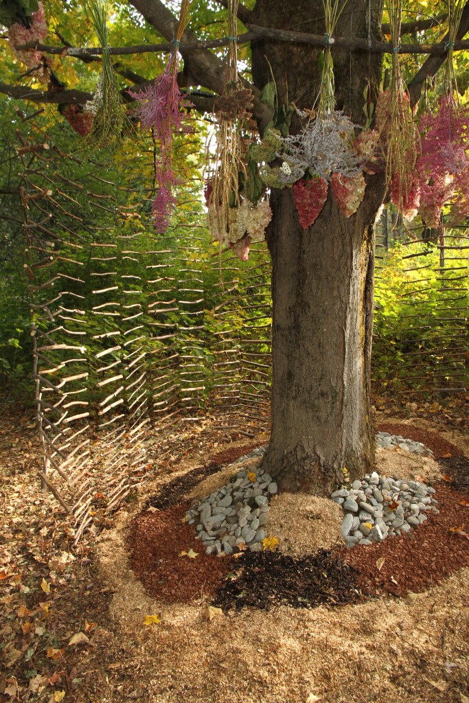 Ainsi, autour d’un arbre, des branches et des plantes seront suspendues à différentes hauteurs, l’enveloppant, créant un lieu secret, intime. Au sol, des pierres de différentes grandeurs, de la paille et d’autres éléments de la nature formeront un mandala, ce qui renforcera le sentiment de calme, de sécurité et de confort.