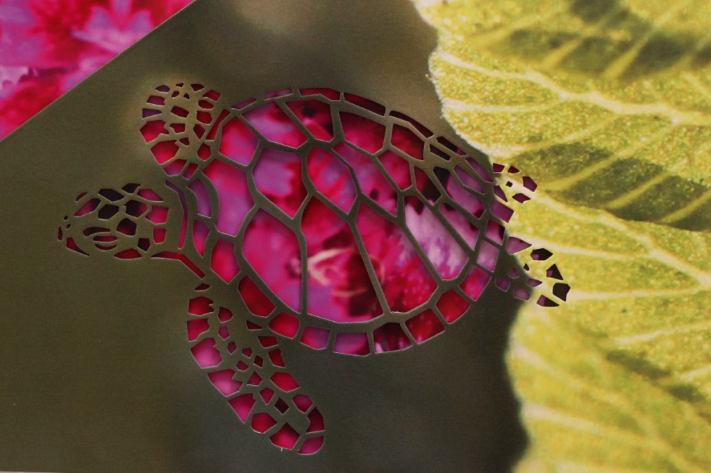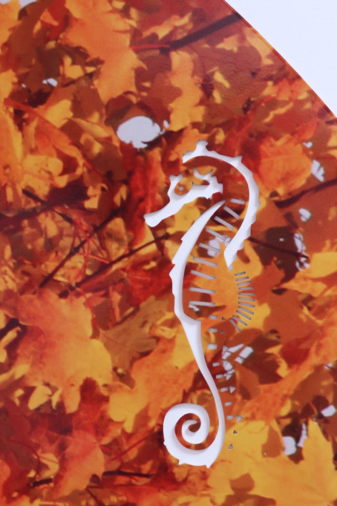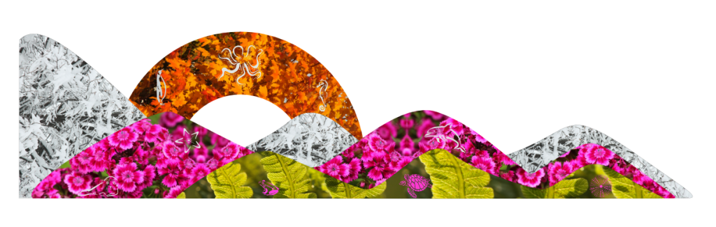 Faisant référence à l’environnement de la ville de Rimouski, un paysage fictif aux couleurs des saisons se développe par des formes ondulées qui s’entrecroisent et dans lesquelles sont découpées des silhouettes d’animaux aquatiques représentant un univers rempli de vie.